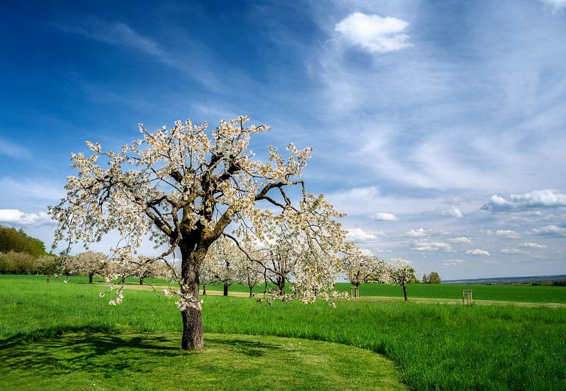Buy the photo Landscape with a blossoming cherry tree by ManfredFotos on canvas, ArtFrame, poster and wallpaper, printed on demand in high quality.
