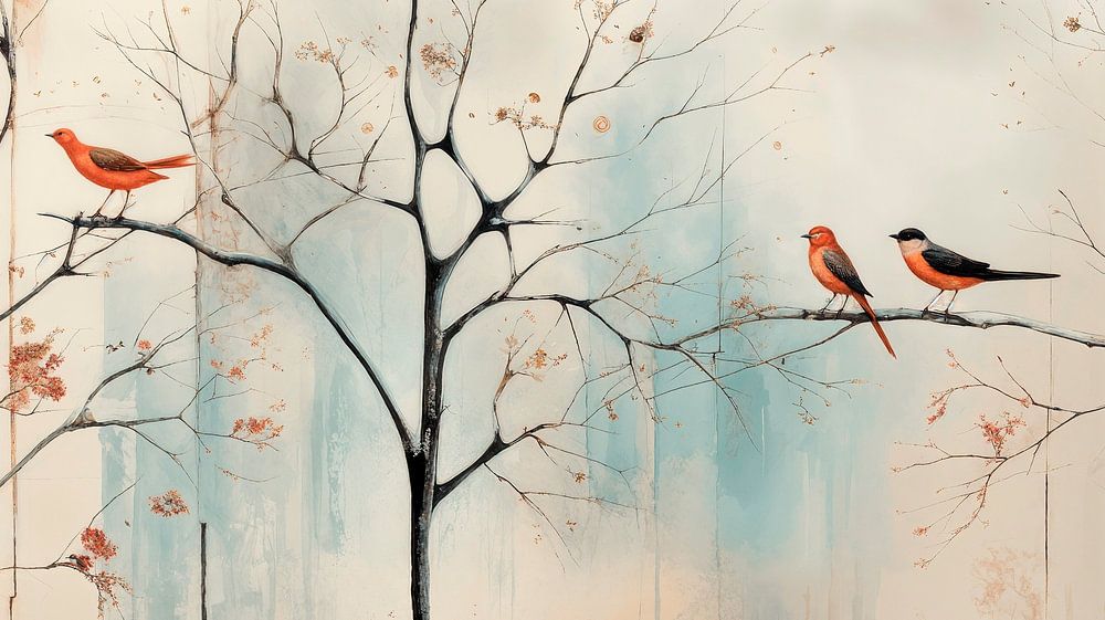 Landscape with birds in trees. Choose the size and material for this work and make it fit your interior.
