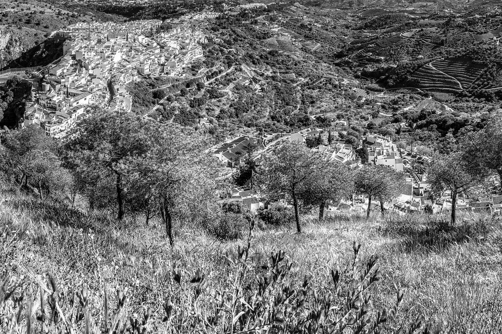 White mountain village Frigiliana in Andalusia on the Costa del Sol in black and white.