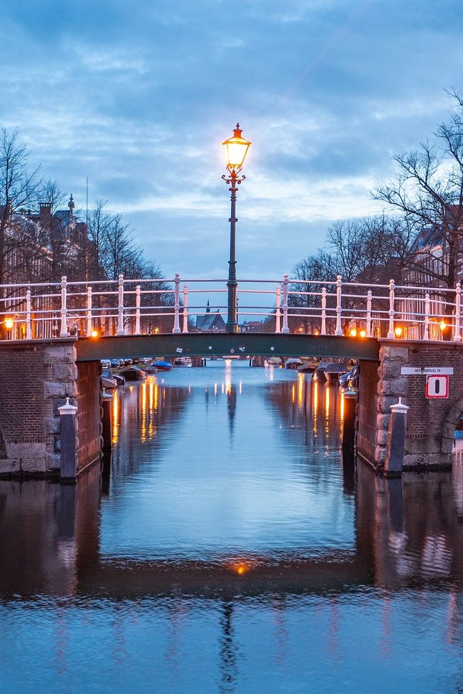 Lantern on a bridge over the Nieuwe Rijn, seen from the Utrechtse Veer, looking towards the Herengracht, Leiden