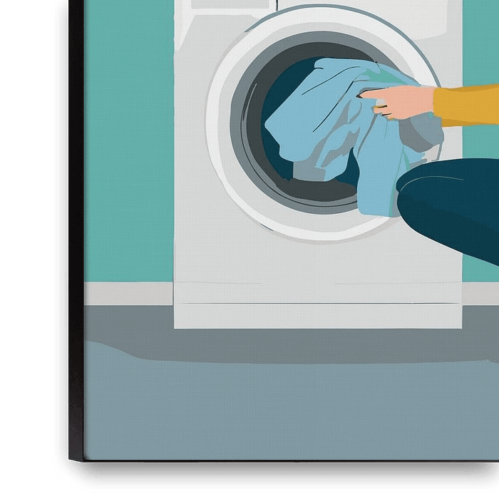 An illustrated vector style painting of a woman loading laundry into a washing machine. The painting is in grey-green color and has the title "Laundry Day".
