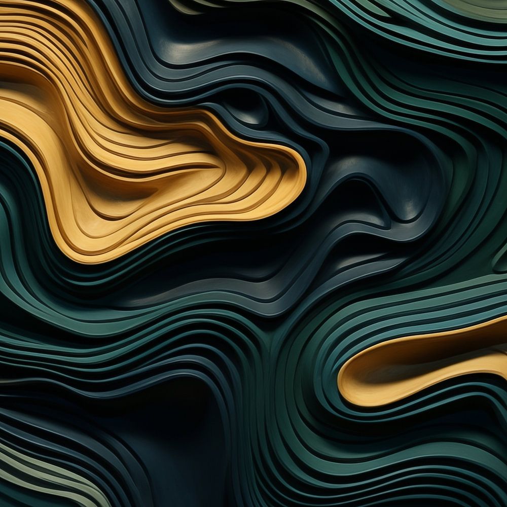 Stylised, abstract landscape, in which the flowing lines and shapes suggest a sense of movement. The colour scheme is dominated by contrasting shades of golden yellow, deep black and various shades of green, giving a sense of depth and richness to the image.