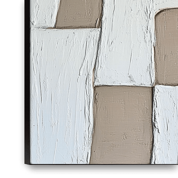 Abstract composition of overlapping and repeating geometric shapes. The work uses a subdued colour palette with soft earth tones, mainly beige, light brown, and white. The shapes in the painting are not perfectly straight or symmetrical, giving the work an organic and fluid look.