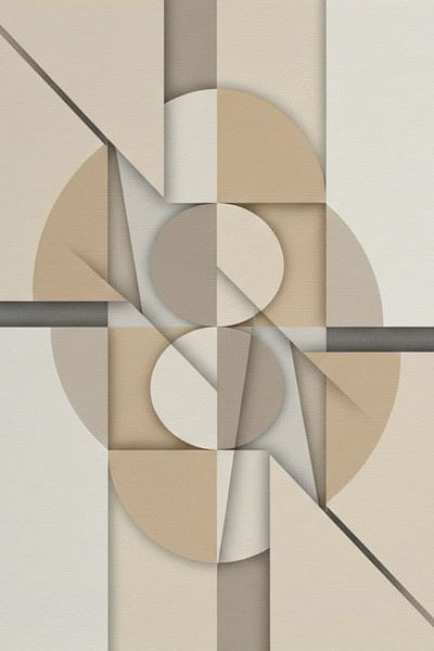 This artwork is a sophisticated exploration of depth, shadow, and geometric precision. It features a complex interlocking of circle, triangles, and rectangles in a soothing palette of cream, sand, and taupe, accented by sharp charcoal line. A unique element that becomes clear upon closer inspection is the subtle leathery texture applied…
