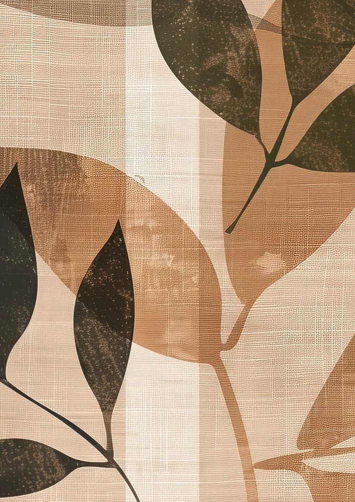 Leaves Painting | Autumn Whispers - This leaves painting plays with the simplicity and elegance of natural forms. At its centre are stylised leaves in various autumn colours such as rusty brown, dark brown, and soft beige, which are harmoniously distributed across the canvas. These leaves vary in size and shape, some broad and round, others long and pointed. Striking is the precision in the texture of the leaves, which gives the whole a tactile feel. The background is subtle and textural, with a pattern reminiscent of linen or woven fabric, in a soft beige colour palette. What makes this minimalist leaves painting so special is the balance between the distinct shapes of the leaves and the quiet, subtle background, giving the work a serene feel. By using earth tones, it creates a warm and natural feel, which could fit perfectly into a contemporary interior that exudes natural elements and tranquillity.