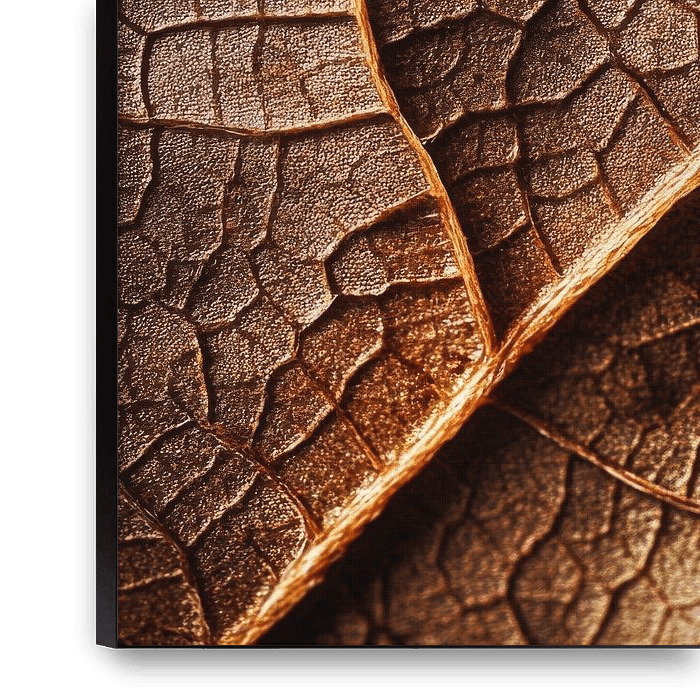 Fine, velvety textures unfold in warm, earthy tones, while the interplay of light and shadow emphasises the cracks and folds of the dried leaves. Every detail tells of the transience of nature, whose beauty and fragility both fascinate and inspire. An aesthetic reflection of the cycle of life, where past and present merge.