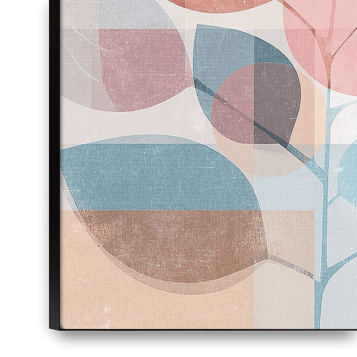 Leaves Motif - This minimalist painting features a colourful botanical design with leaves in soft shades such as light blue and peach, perfect for a modern interior. Details: leaves, modern, painting, art, botanical, light blue, peach, abstract, decoration, interior Colours: light blue, peach, grey, cream Leaves Motif