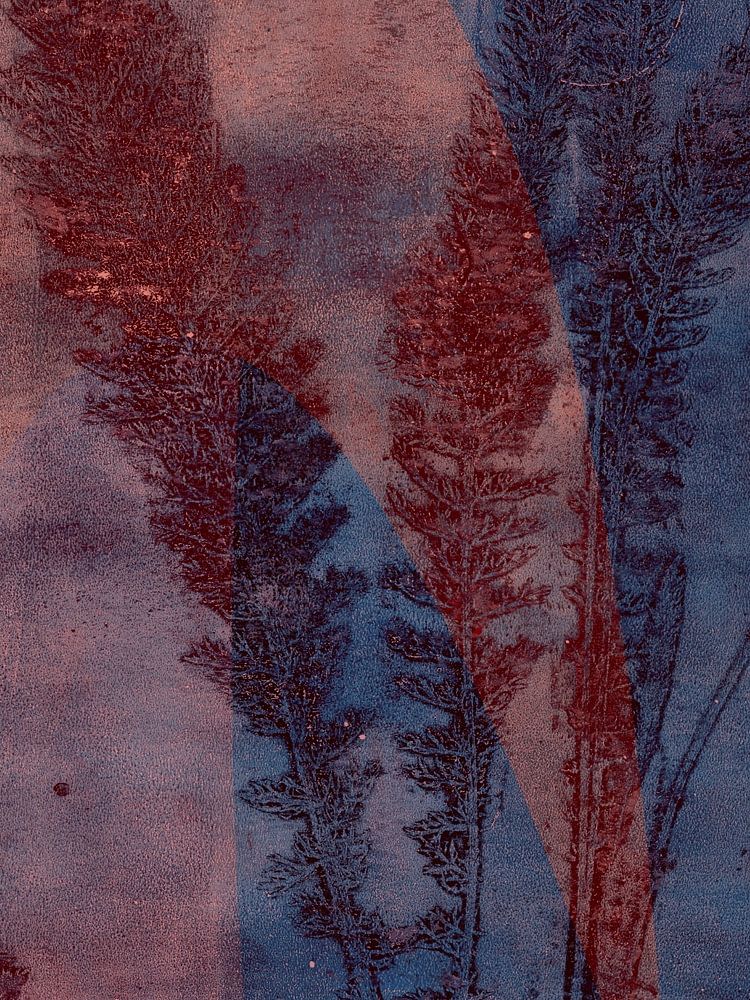 The color palette shifts across the series. Some monotypes feature deep cobalt blue and light blue, others appear in earthy tones of rusty brown, muted terracotta, or soft purple. These shades combine with the natural plant forms to create a calm, timeless look that works beautifully in many interiors.