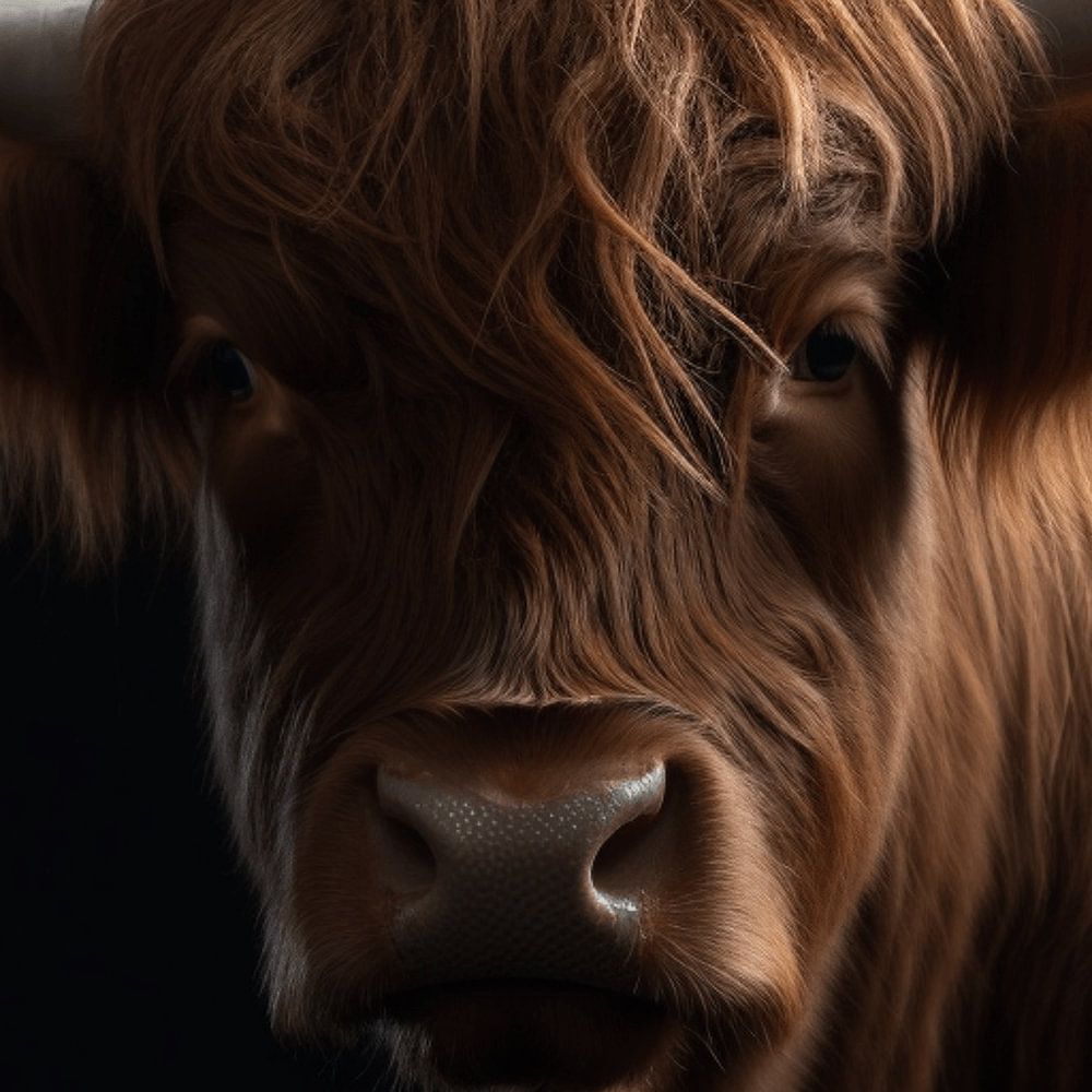 The digital artwork is carefully created with brush strokes that highlight the natural texture of the coat and capture the rustic atmosphere of the landscape. The Scottish Highlander's expression exudes calmness and strength, as the animal stands calmly grazing or simply enjoying the serene beauty of its surroundings.