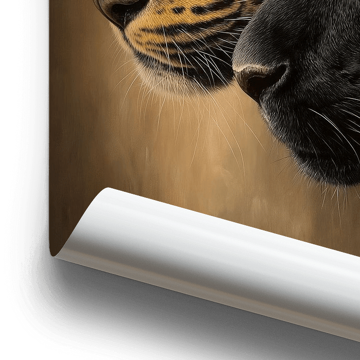 This photorealistic painting shows a powerful and intimate depiction of two large felines: a leopard and a black panther, depicted in side view with their heads close together. The leopard on the left has golden yellow fur with distinct black rosettes, while the panther on the right has deep, almost velvety black fur in which subtle…