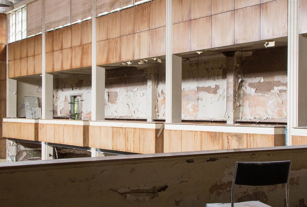Two chairs in an abandoned theater in the former GDR. Dusty as if time stood still. Full of expectations! Will there be a performance or not. Round 50's lamps. Retro atmosphere.