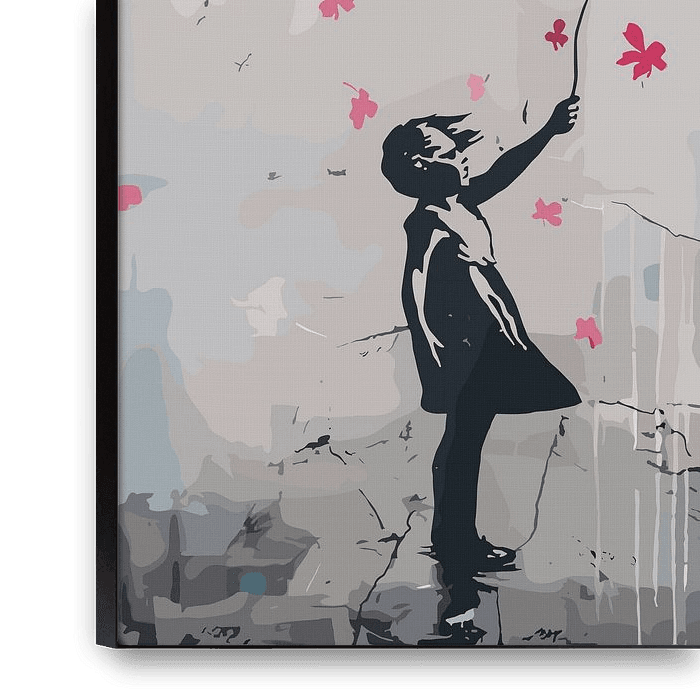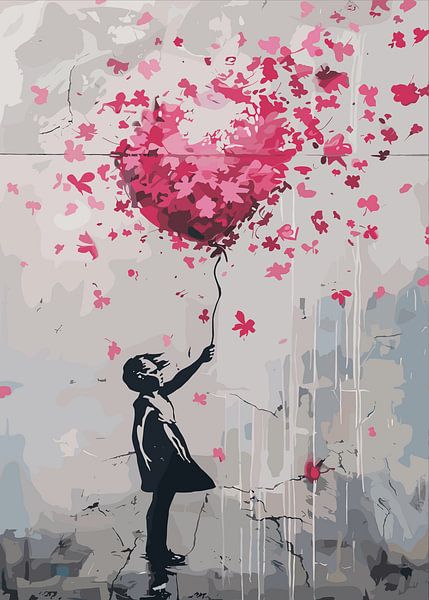 This artwork shows the silhouette of a child releasing a heart-shaped balloon formed from scattered pink blossoms. The contrast between the dark figure and the soft, textured background creates an immediate emotional focus. Delicate petals float freely around the heart, suggesting movement, fragility, and transformation. Fine cracks and…