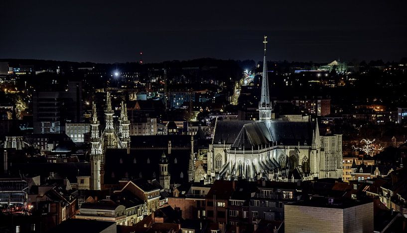 Evening view of St Peter's Church and Leuven Town Hall in Belgium, seen from the tower of the city's university library.