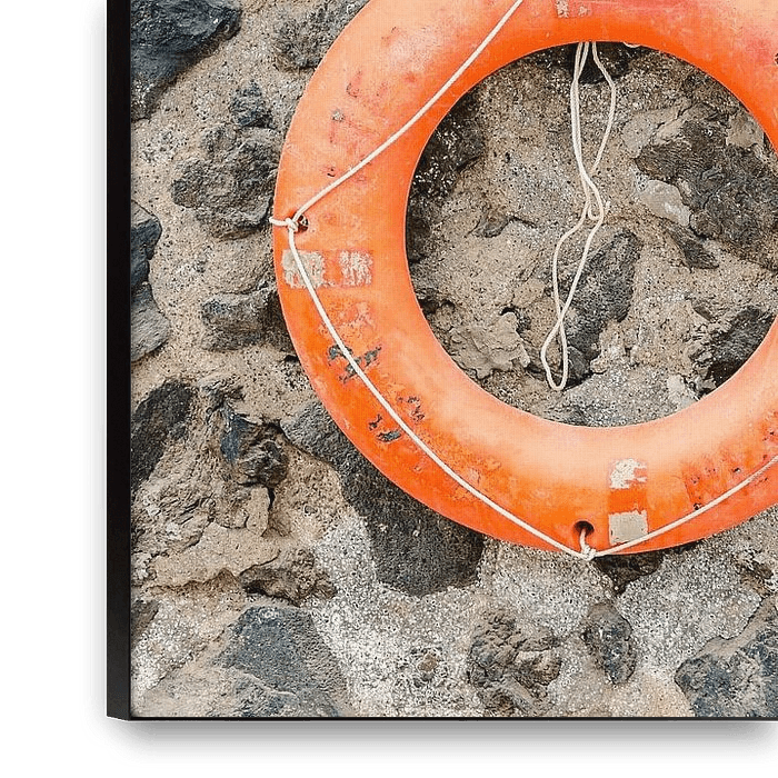 Buy the photo Lifebuoy in front of stone structure by Alexander Baumann on canvas, ArtFrame, poster and wallpaper, printed on demand in high quality.