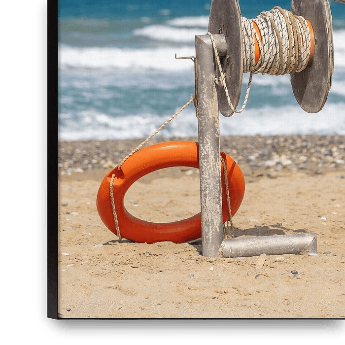 Lifebuoy with throwing device on the beach of Crete, Greece. Taken in summer. The lifebuoy hangs from a cord connected to a wooden pulley and crank. It is used to throw this ring onto the water and then pull the person ashore more easily.