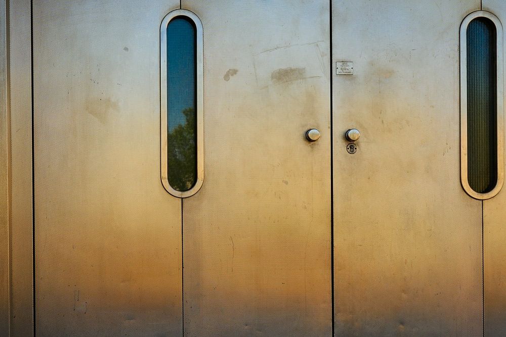 These are large, steel entrance doors for the material of the fairs' participants. There are separate entrances for visitors. A bridge construction connects the building to the adjacent exhibition building, the Messe.