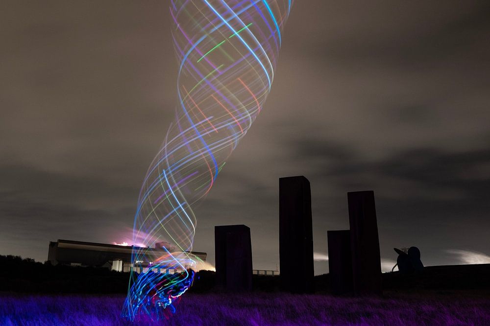 Tornado of lights in a colored landscape of purple and blue grass. The background is the steel plant of Tatasteel in the IJmond region.