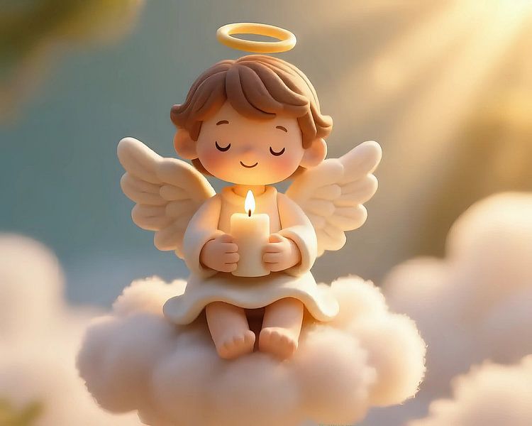 The photo shows an angel with majestic, open wings, gently holding a flickering candle. The angel is draped in delicate, light-flooded robes that vividly emphasise the grace and ethereal character of the being. The wings stretch far into the sky and present fine details of the feather structure that shimmer in the light. Their soft…