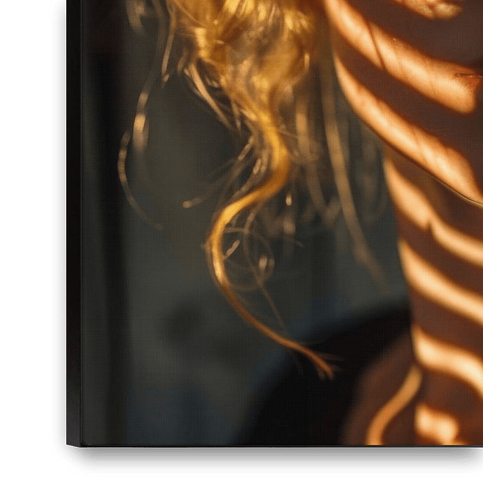 This impressive portrait of a woman captures the mesmerising effects of light and shadow cast on her face by a geometric pattern. The warm rays and intense shadows give the image a vibrant and profound atmosphere. Perfect for lovers of artistic and atmospheric photography who appreciate the magic in the interplay of light and shadow.