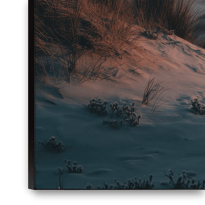 In the soft twilight, a hushed coastal landscape unfolds, where dunes and sea slowly merge. From the sand hills, the eye leads to a lone lighthouse in the distance, shrouded in light mist. The pastel-coloured light of the setting sun gives the landscape a calm, almost timeless atmosphere.