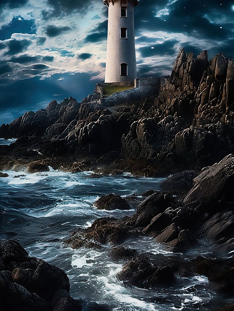 Buy this landscape artwork Lighthouse at night by fernlichtsicht on canvas, ArtFrame, poster and wallpaper, printed on demand in high quality.