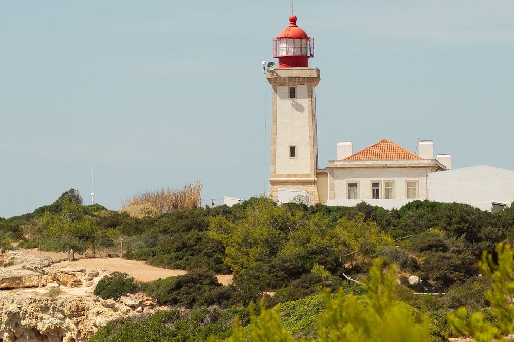Lighthouse in the Algarve in Portugal on the cliffs in the countryside.