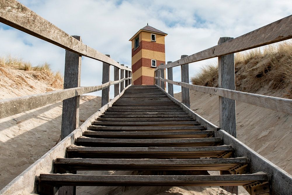 Lighthouse of cape dunes in Dishoek Zeeland seen from below from the wooden staircase.