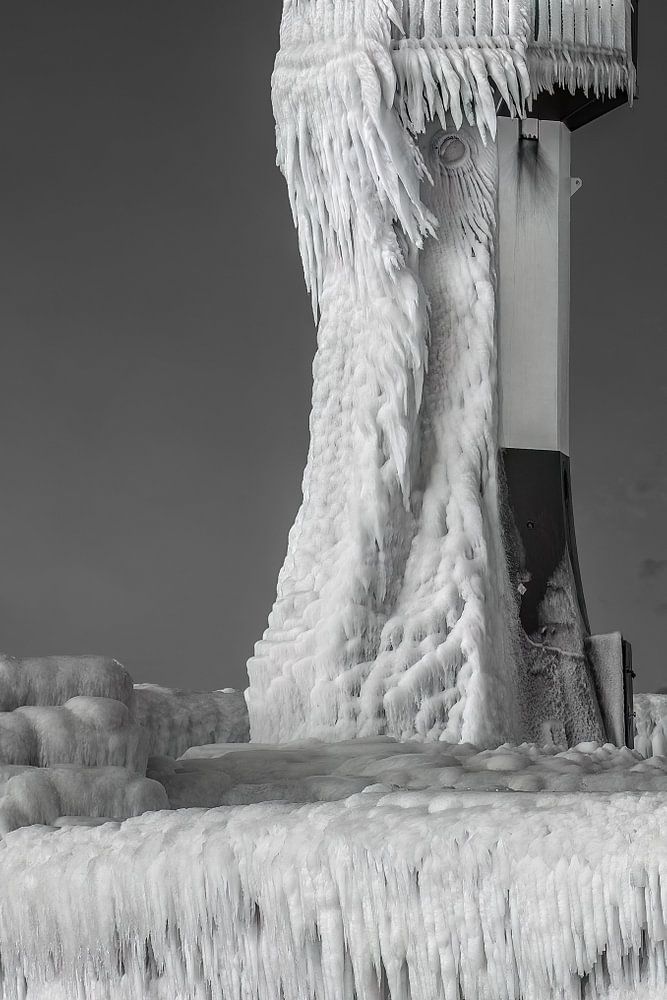 The high lashing waters of the Baltic Sea hit the lighthouse and the stones in front of it, and then solidified into bizarre ice forms as they ran down.
