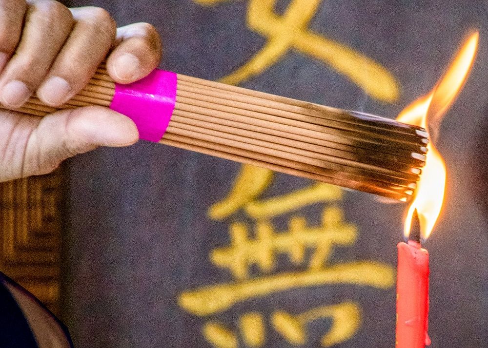 Someone lights a bunch of incense sticks in a candle flame to sacrifice in a temple.