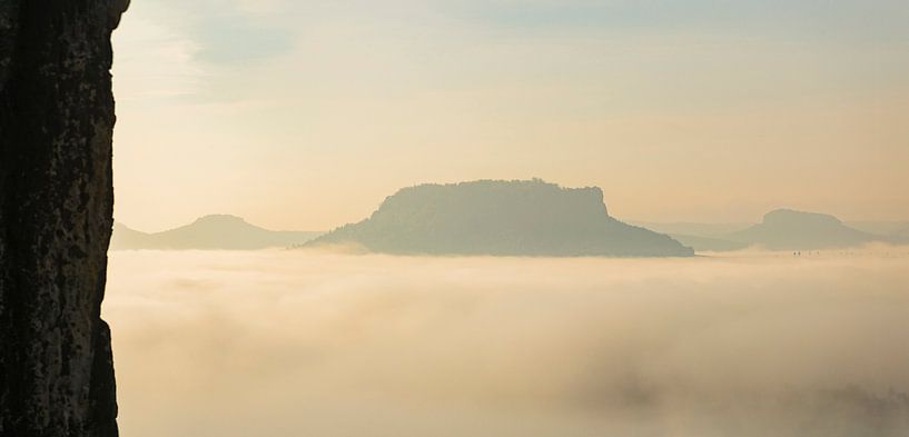 Lilienstein in the morning mist in Saxon Switzerland.
