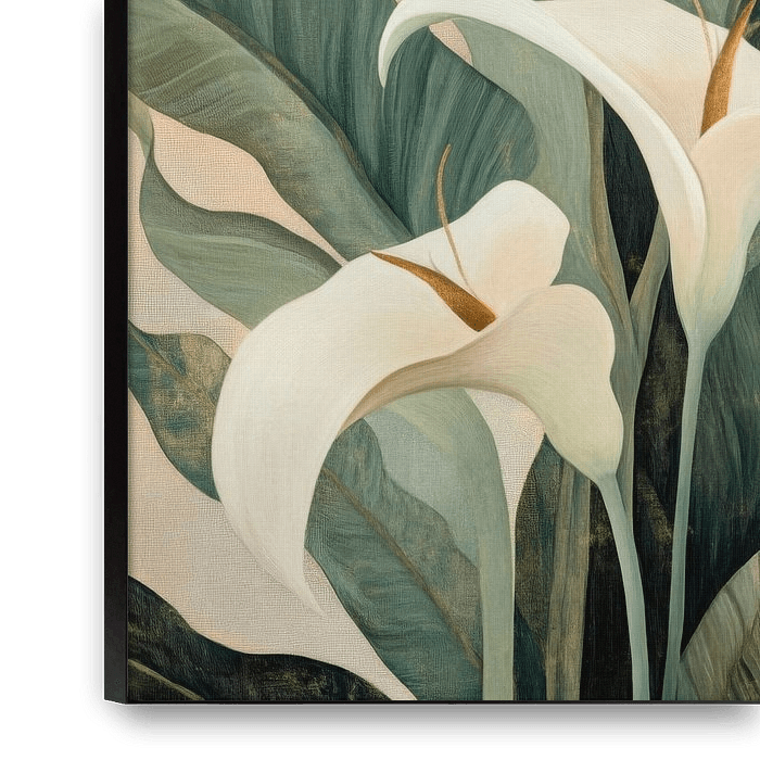 A harmonious interplay of curved, delicate lines and vibrant shades of green unfolds in this floral composition. The elegant, white blossoms rise proudly between strong leaves and create an atmosphere of grace and tranquillity. Soft colour tones play around the shapes and invite you to dream. Nature blooms here in stylish splendour.