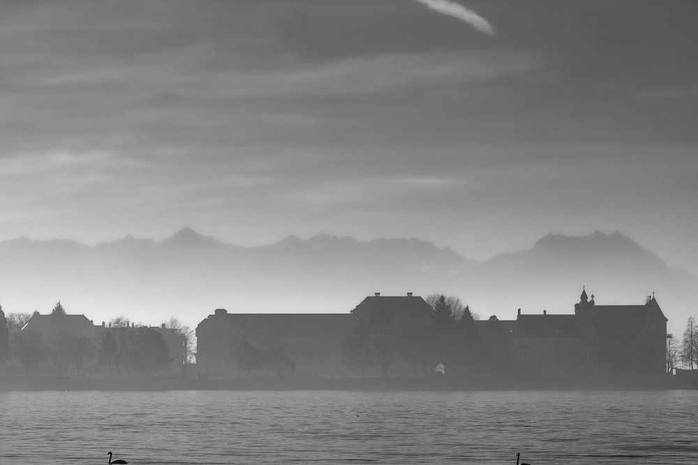 Skyline of Lindau island in Lake Constanze on a hazy morning. The Alps are visible in the background