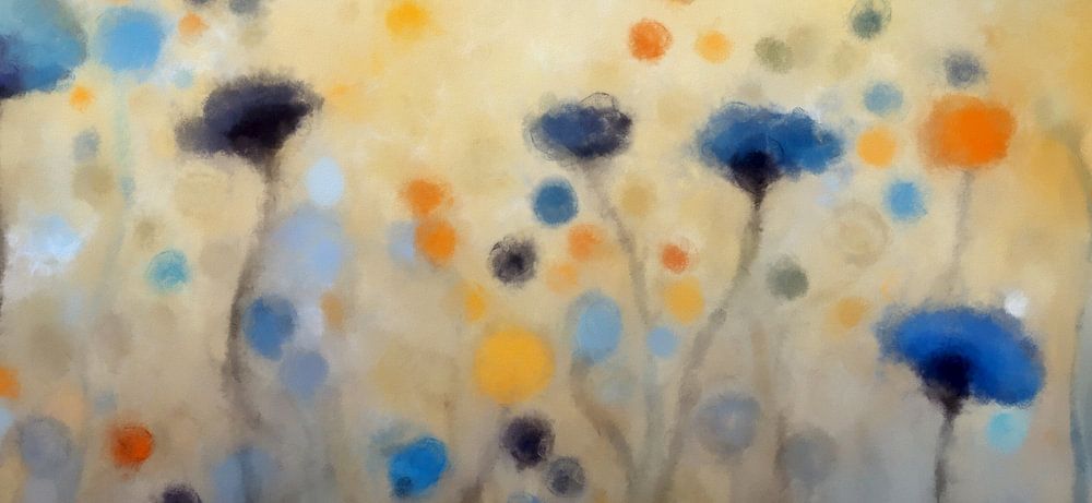 Delicate flowers with blue and orange hues seem to float dreamily across a soft, pastel background. The scene evokes a sense of tranquility and gentle beauty with its abstract representation and harmonious colors.