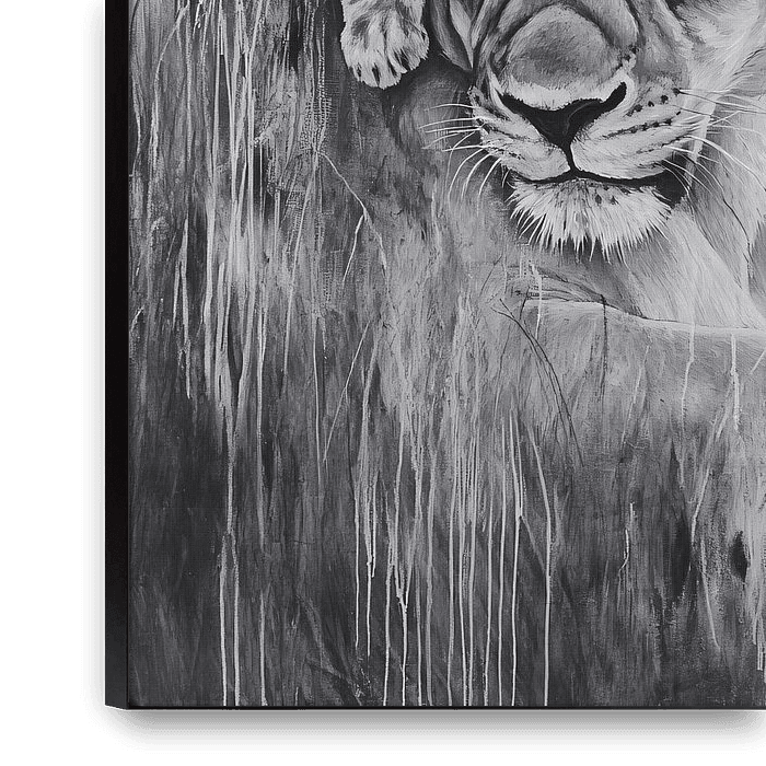 This beautiful black-and-white artwork shows a touching scene of a lioness with her cub. The soft brushstrokes and monochrome tones bring out the lioness' deep bond and protective instinct, while the cub rests confidently on her. This stylish image fits perfectly into modern interiors, especially in rooms where tranquillity and…