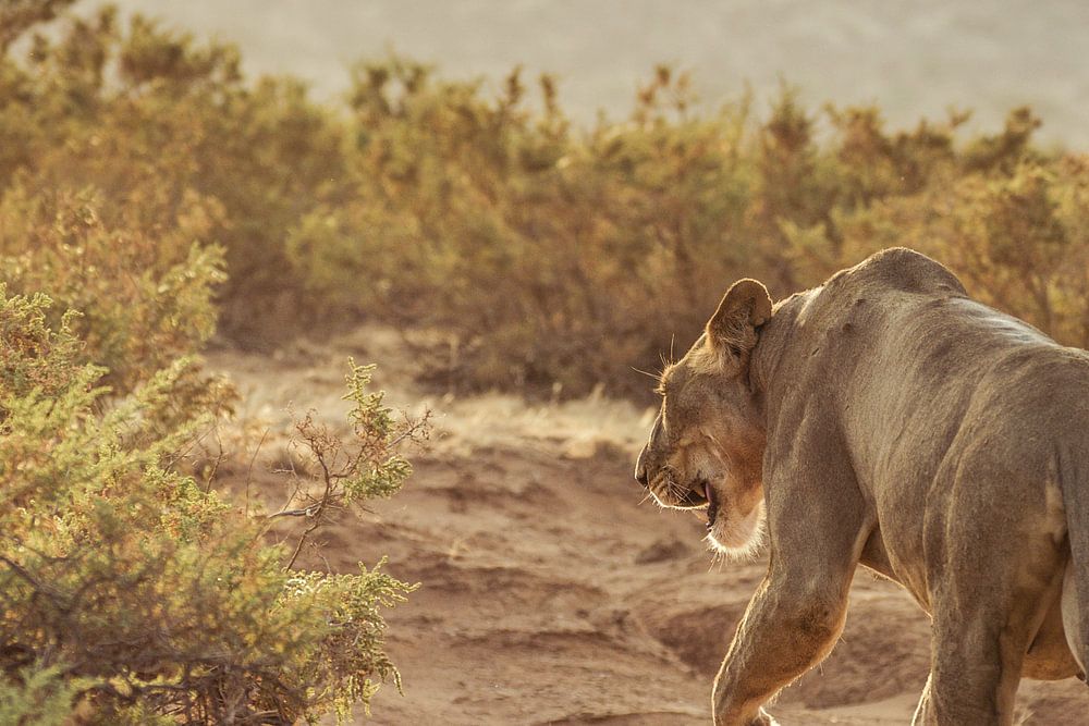 A pregnant lioness in Samburu National Park, Kenya, is looking for a place to give birth to her cubs at sunset.