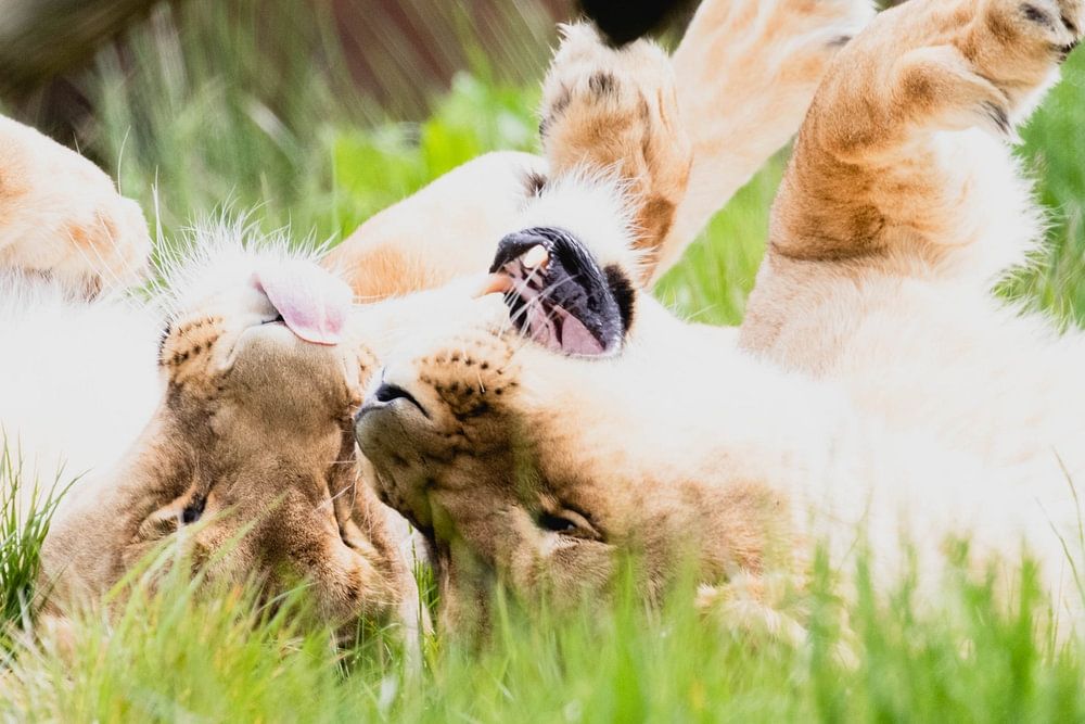 Beautiful majestic animals. The lions in the Beekse bergen safari park. 2 males, 3 females playing, lazing around