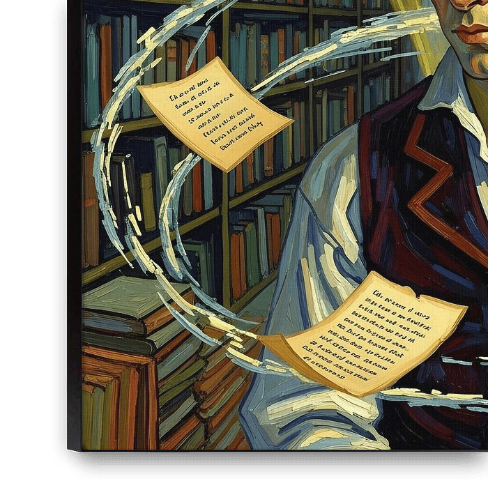 This evocative portrait, rendered in a style heavily influenced by Vincent van Gogh’s iconic impasto technique, captures a pensive scholar amidst a whirlwind of literary creation. The subject is framed by towering bookshelves that recede into a deep perspective, while swirling ribbons of light and loose manuscript pages orbit him like…