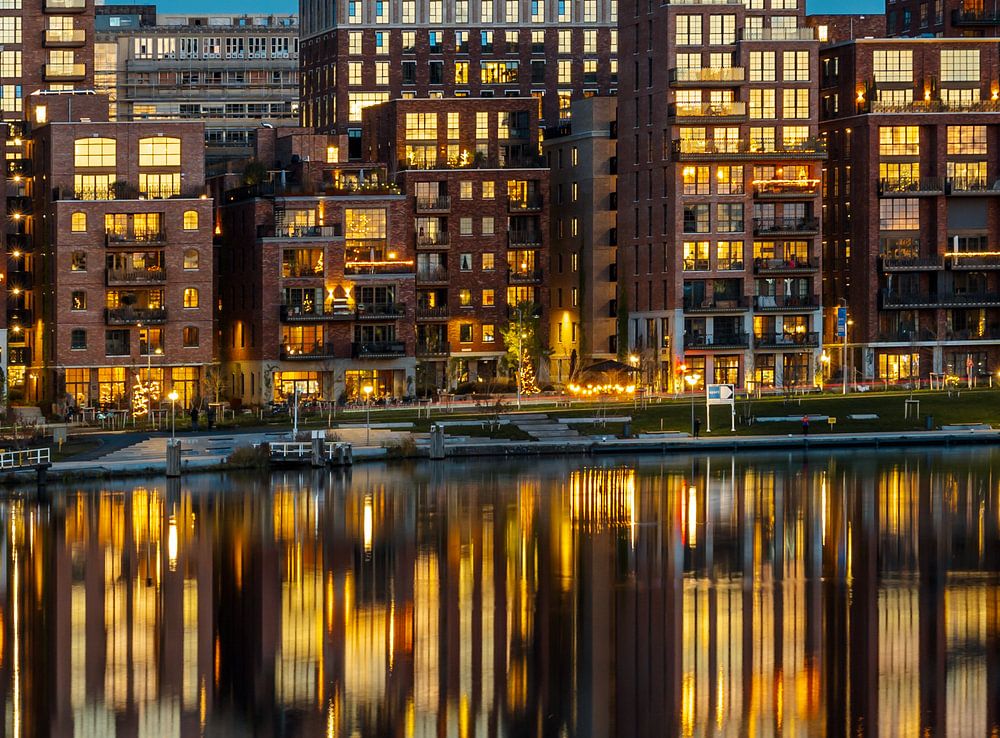 The buildings Little-C on the Coolhaven Rotterdam during the golden hour. The setting sun reflects beautifully in the windows of the buildings giving it this beautiful warm golden glow. The effect of the reflection in the water of the Coolhaven completes this picture. The skyline of NewYork in Rotterdam.