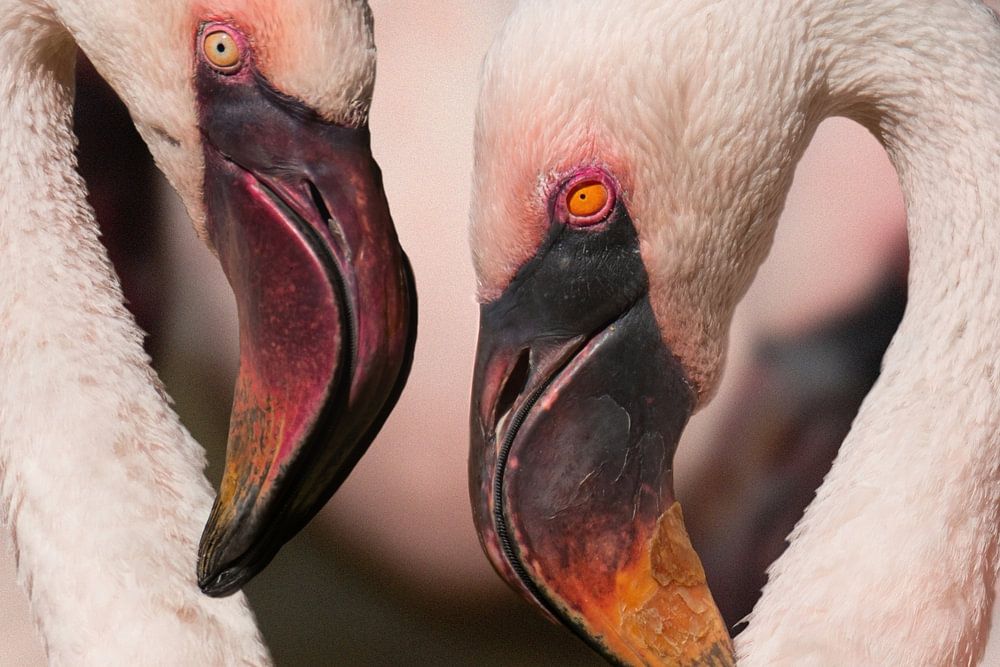Lesser flamingo, dwarf flamingo (Phoeniconaias minor). Close-up portrait of two small flamingo's, facing each other with their heads. This species is found in western, central and southern Africa and in western Indian subcontinent
