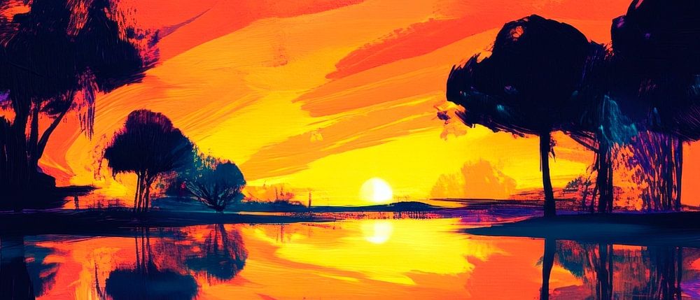 A fairytale sunset unfolds in vivid shades of purple and orange, while the silhouette of a gentle landscape shimmers in the foreground. The calm water mirrors reflect the play of colours and create a peaceful atmosphere. This work of art brings warmth and inspiration to any living room and invites you to dream and relax.