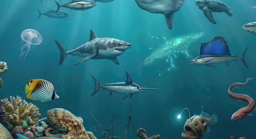 An atmospheric underwater world where various sea creatures come together in the tranquillity and magic of the ocean. The artwork captures the beauty, movement and harmony of life beneath the surface of the sea, bringing a sense of depth and serenity to any space.