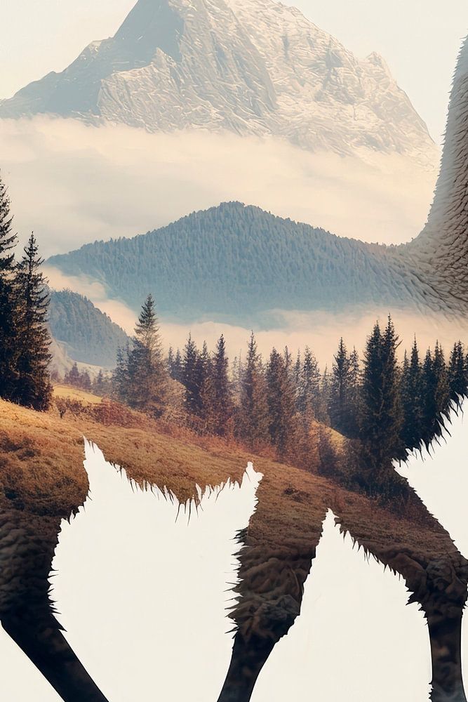 A harmonious fusion of nature and animal, in which majestic mountains and dense forests come together in the body of a llama. This artistic depiction exudes a calming serenity that fits perfectly in a living room to create a relaxed atmosphere and stimulate conversation about the beauty of nature.