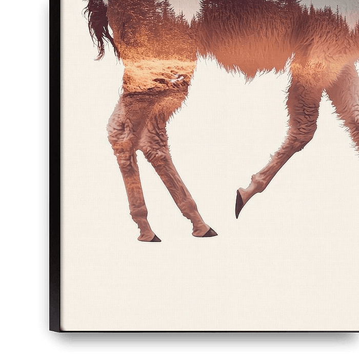A fascinating interplay of nature unfolds here: A llama striding gently through a dream landscape of forests and rolling hills. This harmonious combination of animal and landscape brings peace and inspiration to any room. Perfect for the living room, where it invites you to dream and relax.