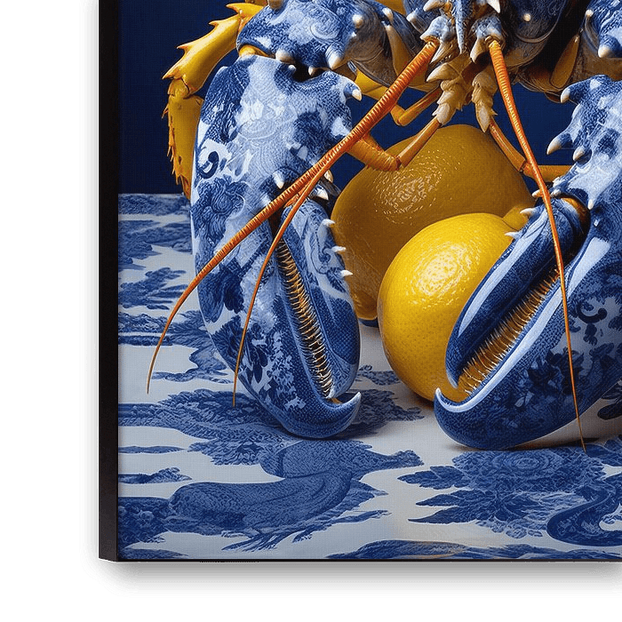 Buy this digital art artwork Lobster Luxe: Delft Blue Lobster with Lemons by Marianne Ottemann - OTTI as a reproduction on canvas, ArtFrame, poster and wallpaper, printed on demand in high quality.