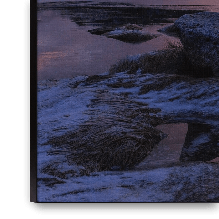 In the winter months, the sunset follows the sunrise almost seamlessly. This creates enchanting atmospheres, especially in this bay, which was partly frozen but also covered with reflective water.