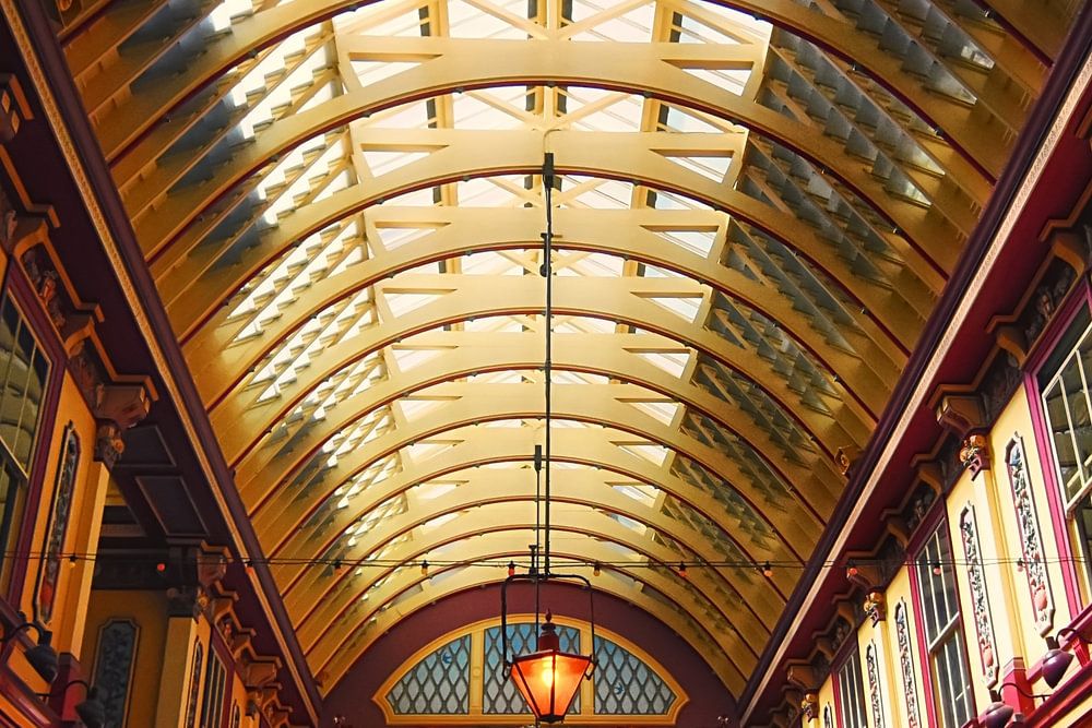 This photo shows one of the side wings of Leadenhall Market. The sunlight shines through the glass roof and bathes the market in a warm light.