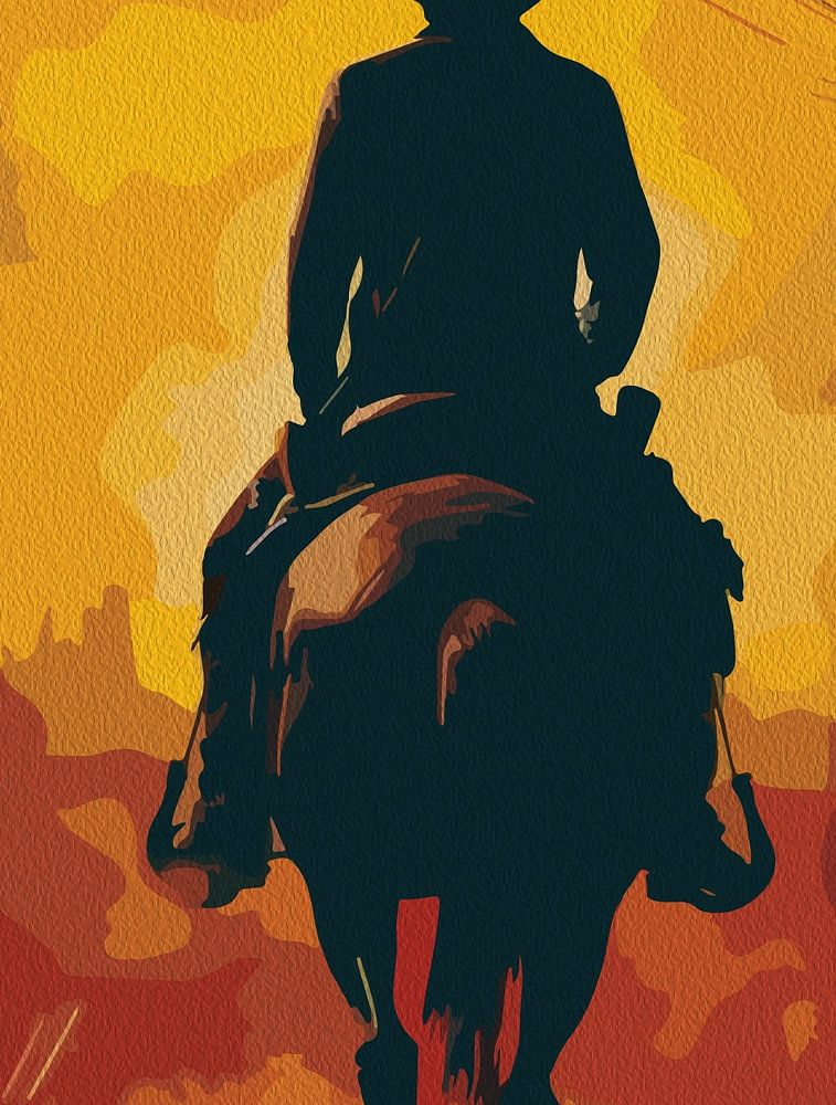 Bring the spirit of the Wild West into your space with this bold wall art featuring a cowboy on horseback riding into a vivid sunset. Rendered in a dramatic silhouette style against a glowing orange and yellow sky, this piece captures the rugged romance and timeless mystery of the American frontier.