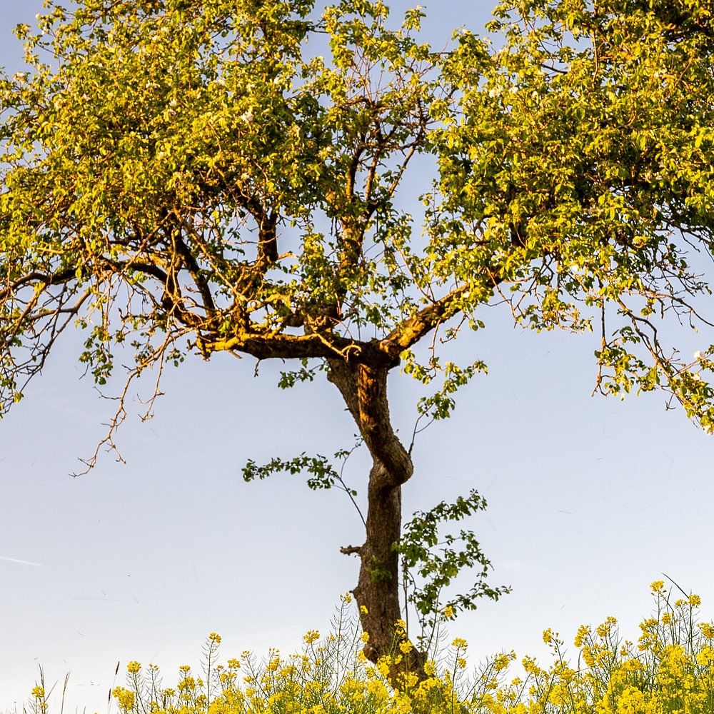 A lone fruit tree surrounded by the beautiful yellow rapeseed in full bloom and beautifully lit by the sun.