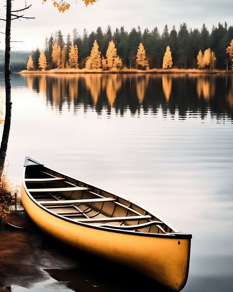 Buy this landscape artwork Lonely canoe on the shore by fernlichtsicht on canvas, ArtFrame, poster and wallpaper, printed on demand in high quality.
