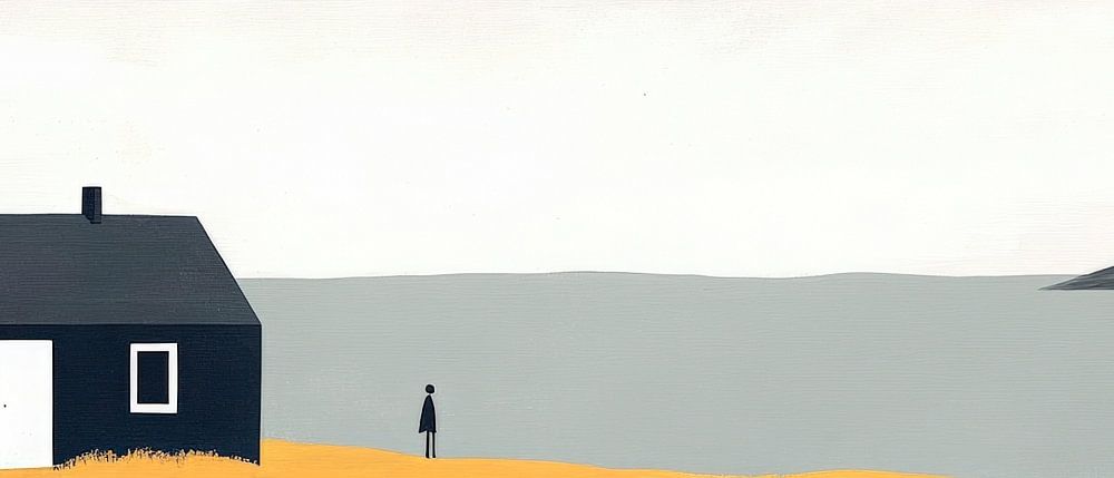 A lonely, simple hut stands in the middle of a gentle coastal landscape, surrounded by golden grasses and grey rocks. The tranquil view of the blue-grey water radiates a peaceful serenity. This work of art fits perfectly into a living room and invites you to dream and relax.